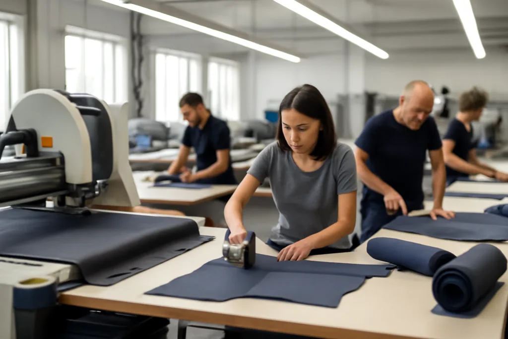 Brands choose from single jersey, pique, French terry, twill, and fleece. Typical GSM (grams per square meter) ranges from 160–240 gsm for tees and polos, up to 280–360 gsm for heavier fleece items. Cut & sew accommodates organic cotton, modal, viscose, and blends with elastane for stretch.