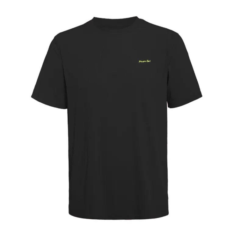 Chest logo, sleeve branding, neck design